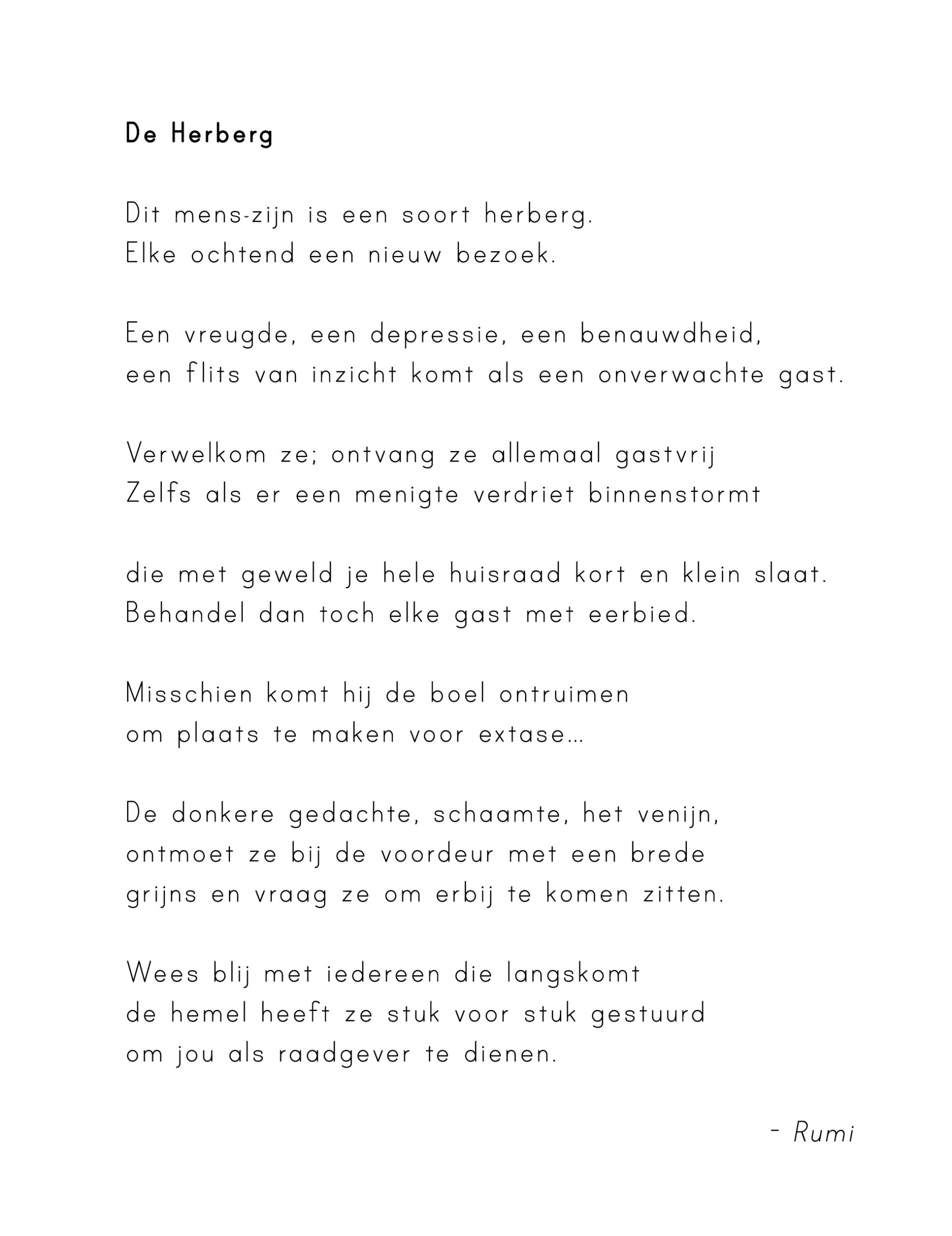 En op zich is dat niet nieuw voor me, maar het is toch nog wel een zoektocht hoe ik daar het best mee om kan gaan. Bij elke dip (die soms behoorlijk diep gaan) is er weer de uitdaging om me er niet te veel tegen te verzetten, want daarmee maak ik het alleen maar groter en moeilijker en complexer. Misschien ken je dat gedicht van de Herberg wel, van Rumi. Over dat elke gast welkom is, zelfs de gast die de boel overhoop gooit. Want wie weet komt hij om ruimte te maken voor iets nieuws. En achteraf zie ik soms dat dat inderdaad zo is, dan blijkt zo’n sombere bui toch schatten met zich mee te hebben gebracht, die aan de oppervlakte buiten beeld zouden zijn gebleven. Dus ik oefen. Met vertrouwen en oké zijn – ook als het niet zo voelt. De afgelopen maand gaf me daar genoeg gelegenheid voor :-)