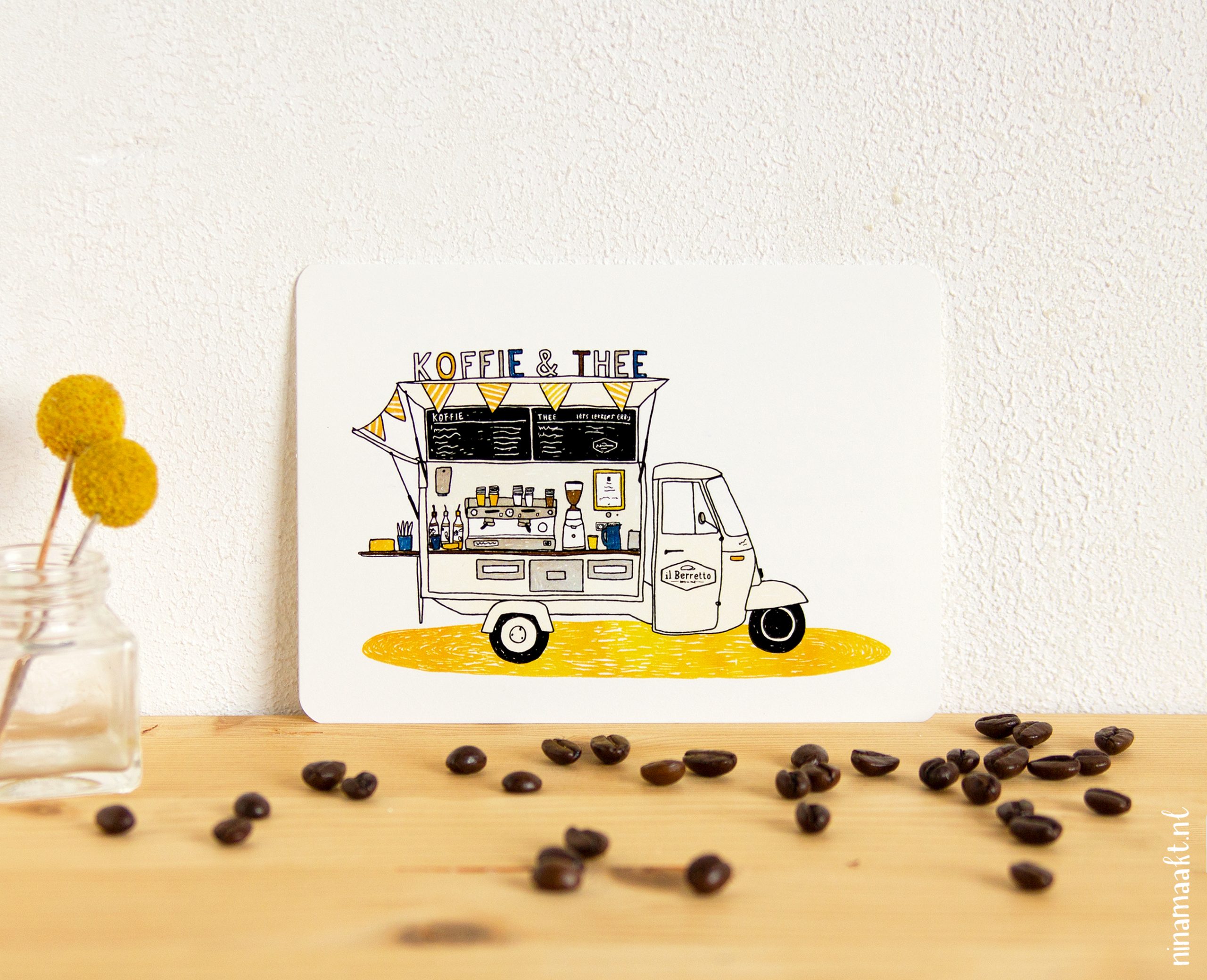 Half augustus nam ik dus een weekje ‘vrij’ om te reflecteren en nieuwe plannen te maken, maar daaromheen rondde ik vooral heel veel opdrachten en projecten af. In mijn geval betekent dat: ontwerpen naar de drukker sturen. Qua werkzaamheden is dat niet de spannendste fase, maar dat wordt gecompenseerd door al die stapels verse kaarten en proefdrukken die de postbode vervolgens komt brengen. En door de blije reacties van klanten, dat ook! Jammer dat ik er nog weinig van kan laten zien, het waren vooral geboortekaarten waarvan de kindjes nog geboren moeten worden. Ach, dan moet je het maar met dit vrolijke koffiebusje doen, die ik voor een klant maakte: