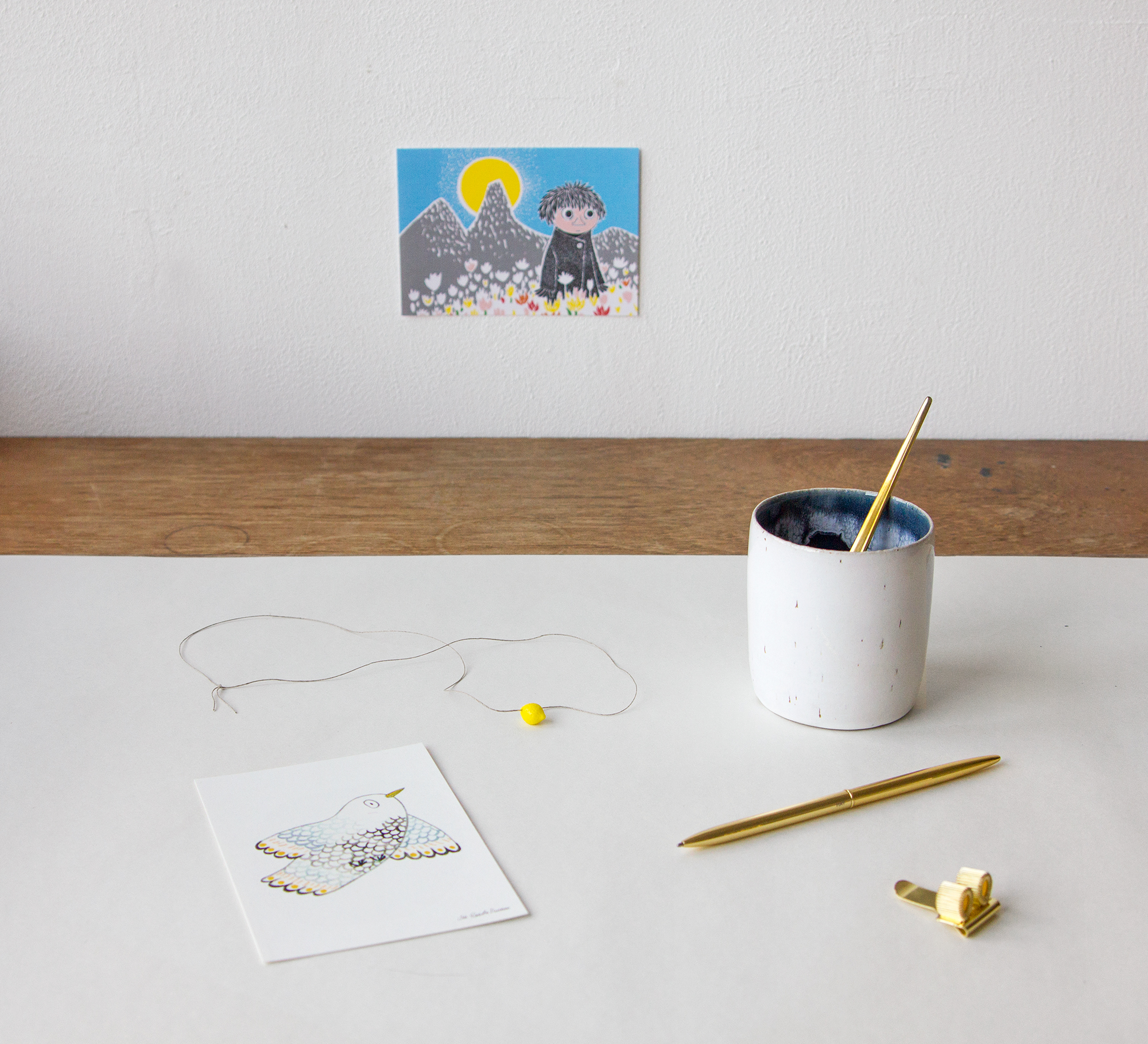 Er is een handvol souvenirs: de handgemaakte mok die me herinnert aan hoe het voelde om in de zee te zijn. Een gouden pen die me terugbrengt naar mooie designwinkels. Twee kaarten met illustraties, die me inspireren om mijn stijl te blijven ontdekken en vrijheid te zoeken in mijn werk. Een piepklein citroentje waar een klein geprint briefje bij zat met de tekst ‘if life serves you lemons, make lemonade’. Ik maakte er een ketting van, zodat ik het kleurrijke kneuterige gevoel om mijn nek kan hangen.