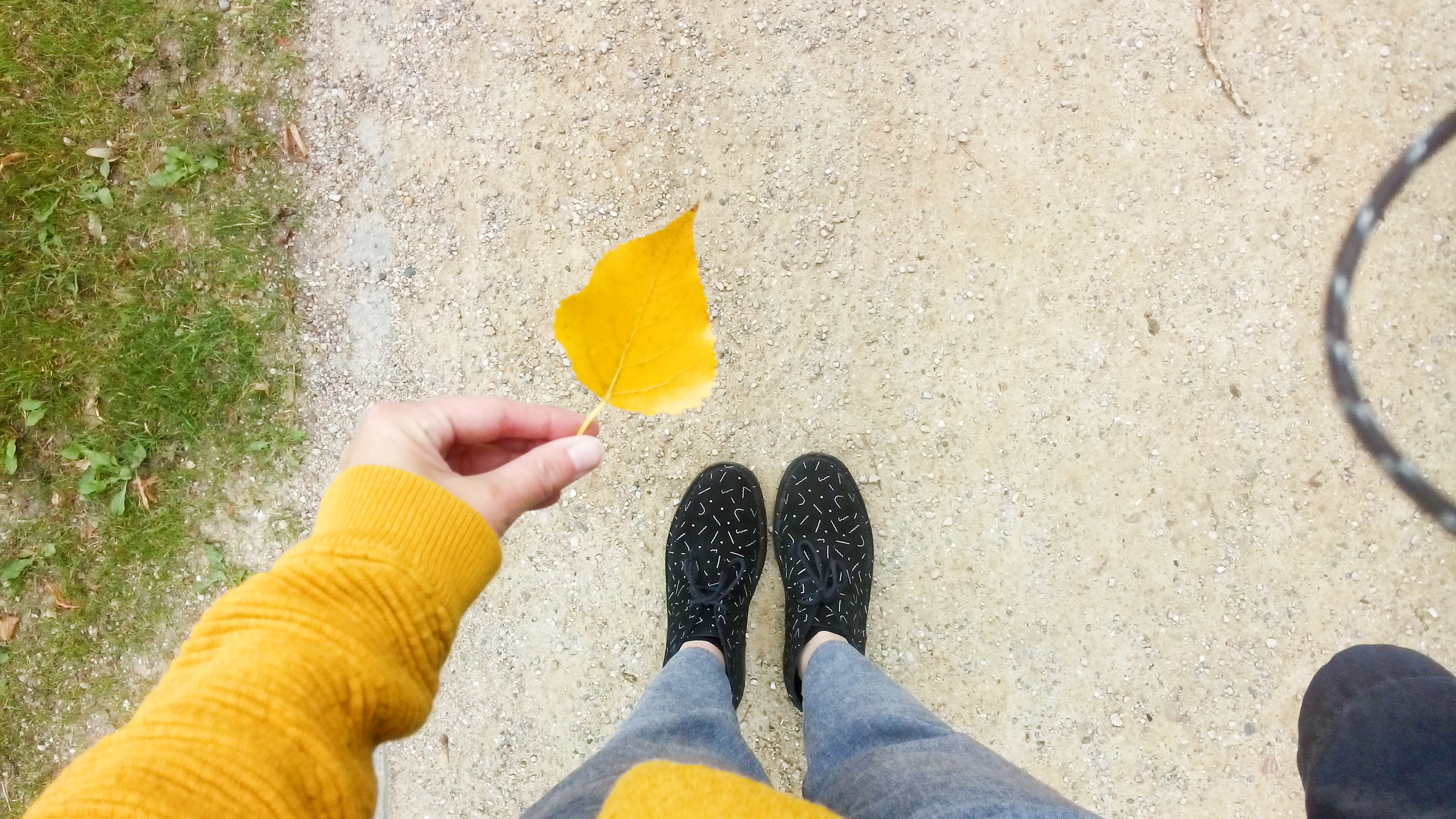 Ik keek omlaag, naar mijn (bijna) nieuwe schoenen, zwart met witte confettikronkels erop. Ze passen bij vandaag. Ik vond een blaadje in het park, in precies hetzelfde geel als mijn trui.