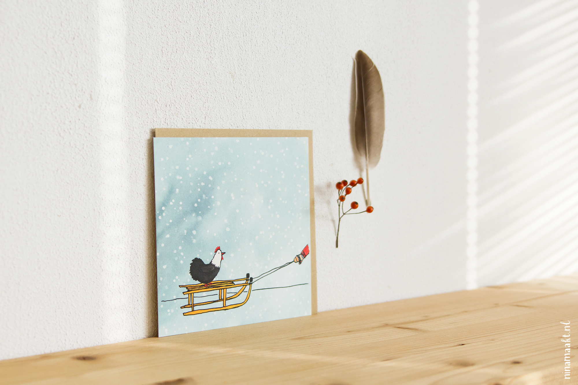 Nog een reden waarom ik blij was dat ik opdrachten had afgerond: ik kon me weer focussen op de webshop. Want november en december zijn kaartjesmaanden! Ik verstuur net zo lief kaarten in maart hoor, maar blijkbaar denkt niet iedereen daar zo over :-) Dus ik introduceerde de winteractie (10 winterkaarten voor €12,50) en liet een nieuwe superwinterse kaart afdrukken. Ik maakte het ontwerp vorig jaar al, nadat ik een blij filmpje had gezien van een haan op een slee. Maar toen was de winter voor mijn gevoel al bijna afgelopen, dus wachtte ik liever nog even met het afdrukken ervan. Dus hoera voor de winterhaan, die dit jaar de webshop een beetje vrolijker en winterser maakt!