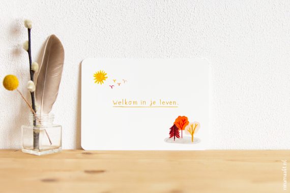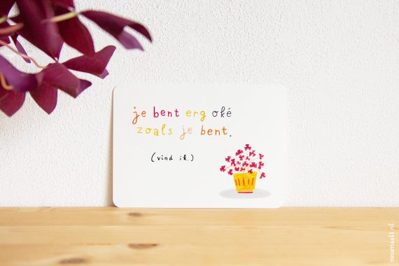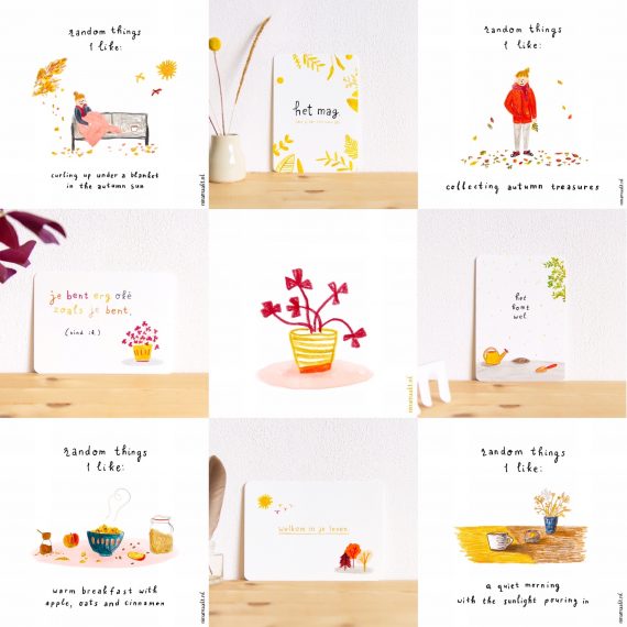 Het is altijd een heel traject om tot iets te komen waar ik echt blij mee en trots op ben. In augustus dacht ik al hard na over thema’s en zinnen. In september tekende en schilderde en schoof en hertekende en schreef en puzzelde ik. En in oktober werkte ik alles af, stuurde ik de ontwerpen naar de drukker, pakte ik ze uit, fotografeerde ik ze, en schreef ik productbeschrijvingen. En nu zijn ze er. Vier nieuwe ansichtkaarten. Volgens mij zijn ze helemaal ninamaakt, en tegelijkertijd zijn ze ook weer ‘nieuw’ – omdat ze voortkomen uit waar ik nu ben, zowel qua thema’s als qua vormgeving. Je ziet ze hier verspreid door deze blogpost.