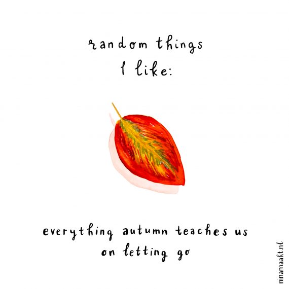 Oef ja, zo fijn! Prachtig hoe alle bladeren nu verkleuren, er is zo veel moois te vinden buiten! Zeker als de zon dan schijnt. Ik zuig alle warme kleuren als een spons in me op, en doe gezellig mee. Mijn illustraties hebben de laatste tijd per ongeluk opvallend veel warme kleuren. En mijn kleren trouwens ook. Ik draag nog steeds mijn zomerjas omdat hij zo mooi matcht met de bomen. En ik kocht twee grote takken met rode besjes/rozenbottels, dus nu voelt het in huis ook extra herfstig.