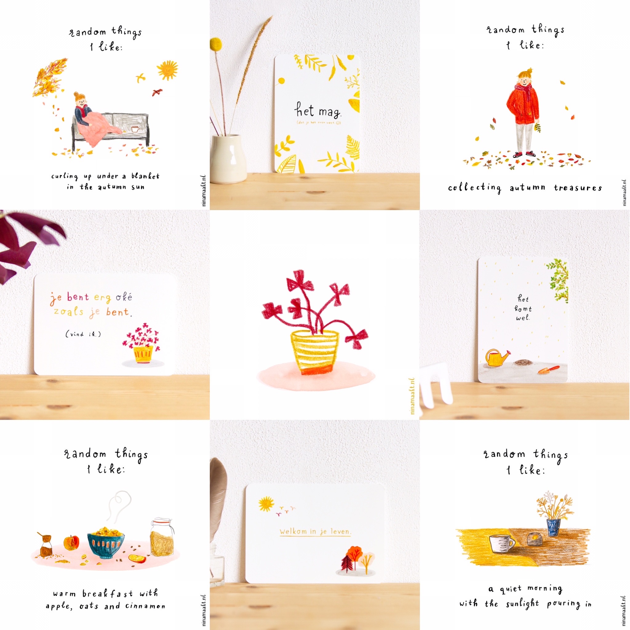 Het is altijd een heel traject om tot iets te komen waar ik echt blij mee en trots op ben. In augustus dacht ik al hard na over thema’s en zinnen. In september tekende en schilderde en schoof en hertekende en schreef en puzzelde ik. En in oktober werkte ik alles af, stuurde ik de ontwerpen naar de drukker, pakte ik ze uit, fotografeerde ik ze, en schreef ik productbeschrijvingen. En nu zijn ze er. Vier nieuwe ansichtkaarten. Volgens mij zijn ze helemaal ninamaakt, en tegelijkertijd zijn ze ook weer ‘nieuw’ – omdat ze voortkomen uit waar ik nu ben, zowel qua thema’s als qua vormgeving. Je ziet ze hier verspreid door deze blogpost.