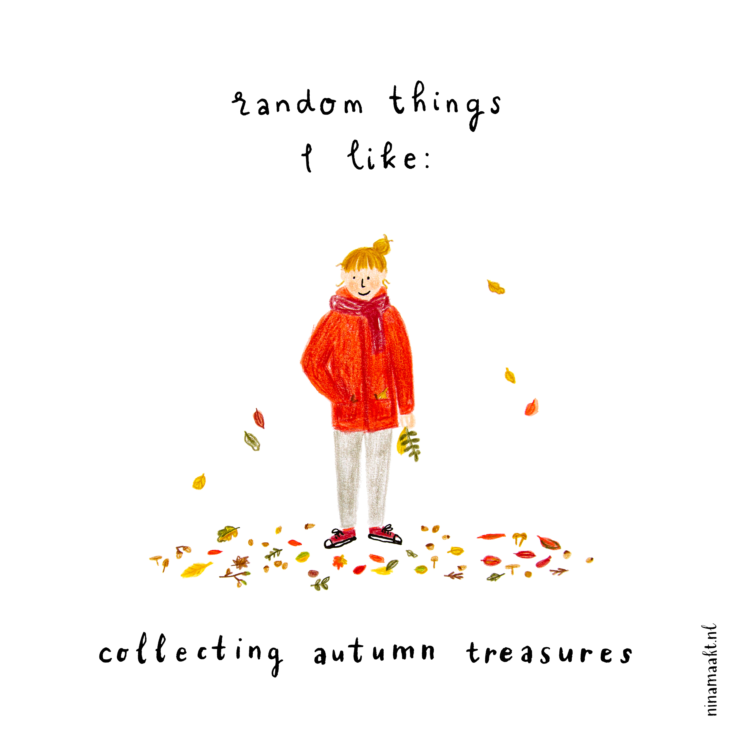 Oef ja, zo fijn! Prachtig hoe alle bladeren nu verkleuren, er is zo veel moois te vinden buiten! Zeker als de zon dan schijnt. Ik zuig alle warme kleuren als een spons in me op, en doe gezellig mee. Mijn illustraties hebben de laatste tijd per ongeluk opvallend veel warme kleuren. En mijn kleren trouwens ook. Ik draag nog steeds mijn zomerjas omdat hij zo mooi matcht met de bomen. En ik kocht twee grote takken met rode besjes/rozenbottels, dus nu voelt het in huis ook extra herfstig.