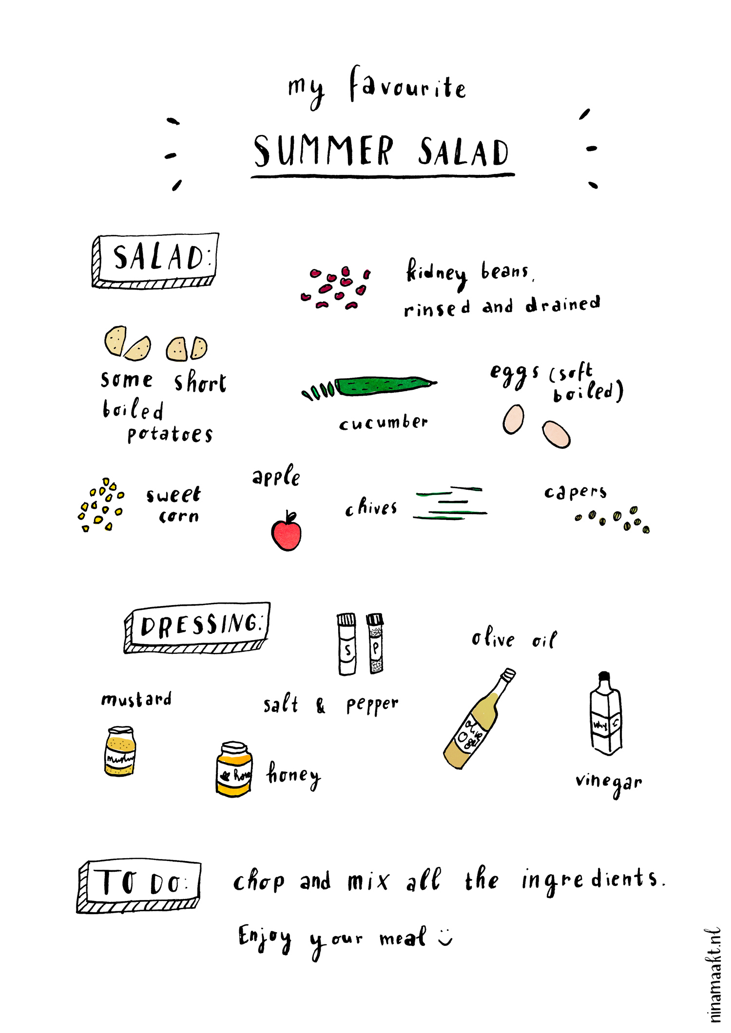 Want hoewel ik stiekem helemaal niet zo van salades houd, is dit een uitzondering. Zo lekker! Ik vond het recept op de mooie blog That Sunday Feeling en paste het een heel klein beetje aan. En ik tekende het, want tekenen, dat doe ik nu eenmaal graag.