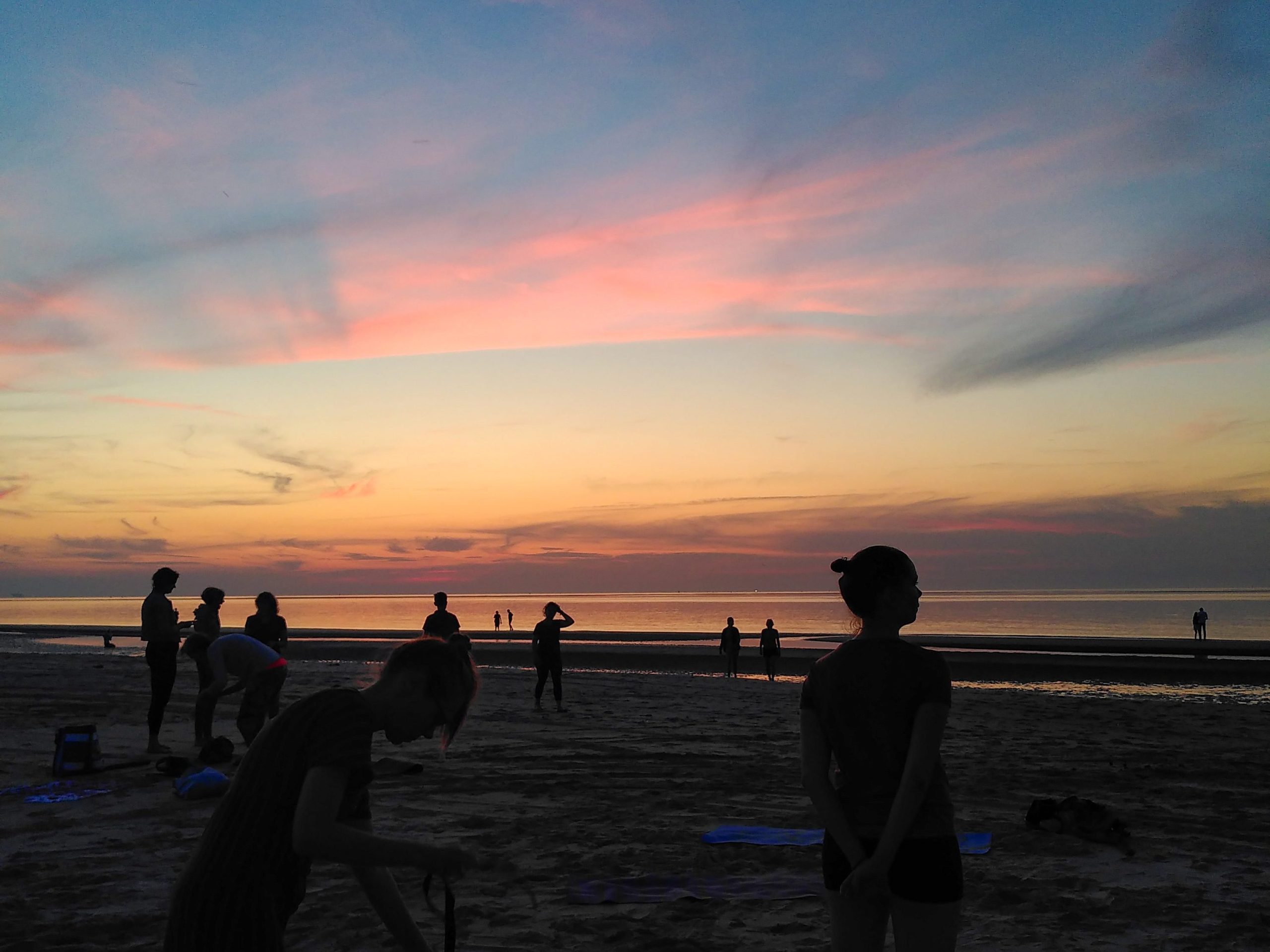 Er was yoga op het strand van Schier, een heel warm weekend lang. Yoga bij zonsopkomst, yoga bij zonsondergang. Zwemmen in een windstille zee, een stiltewandeling op zondag. Door de duinen fietsen met een yogamat vol zand onder de snelbinders van onze gehuurde fietsen. Zand in mijn haar, zand in het huisje, zand in het eten, zand overal.