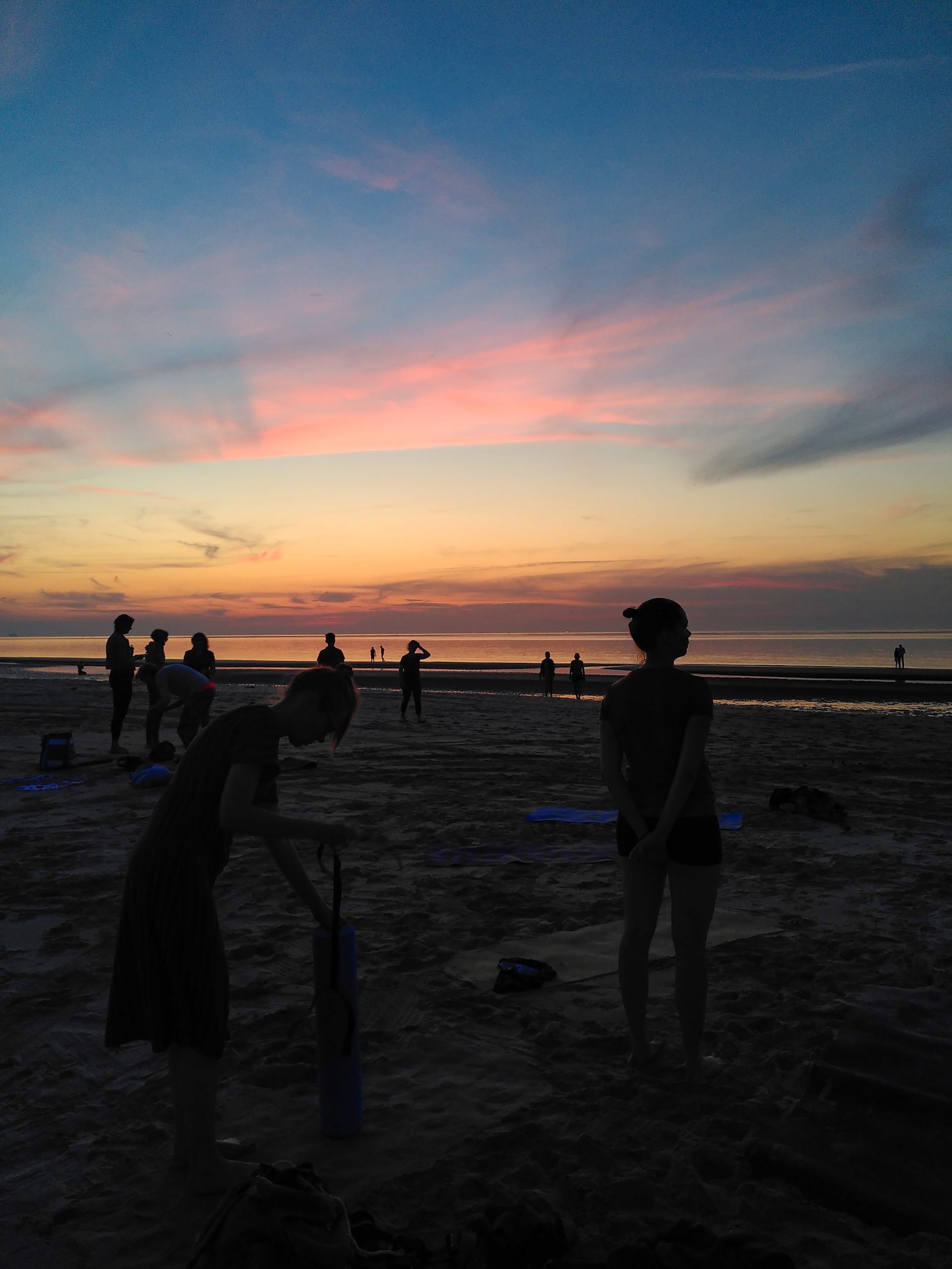 Er was yoga op het strand van Schier, een heel warm weekend lang. Yoga bij zonsopkomst, yoga bij zonsondergang. Zwemmen in een windstille zee, een stiltewandeling op zondag. Door de duinen fietsen met een yogamat vol zand onder de snelbinders van onze gehuurde fietsen. Zand in mijn haar, zand in het huisje, zand in het eten, zand overal.