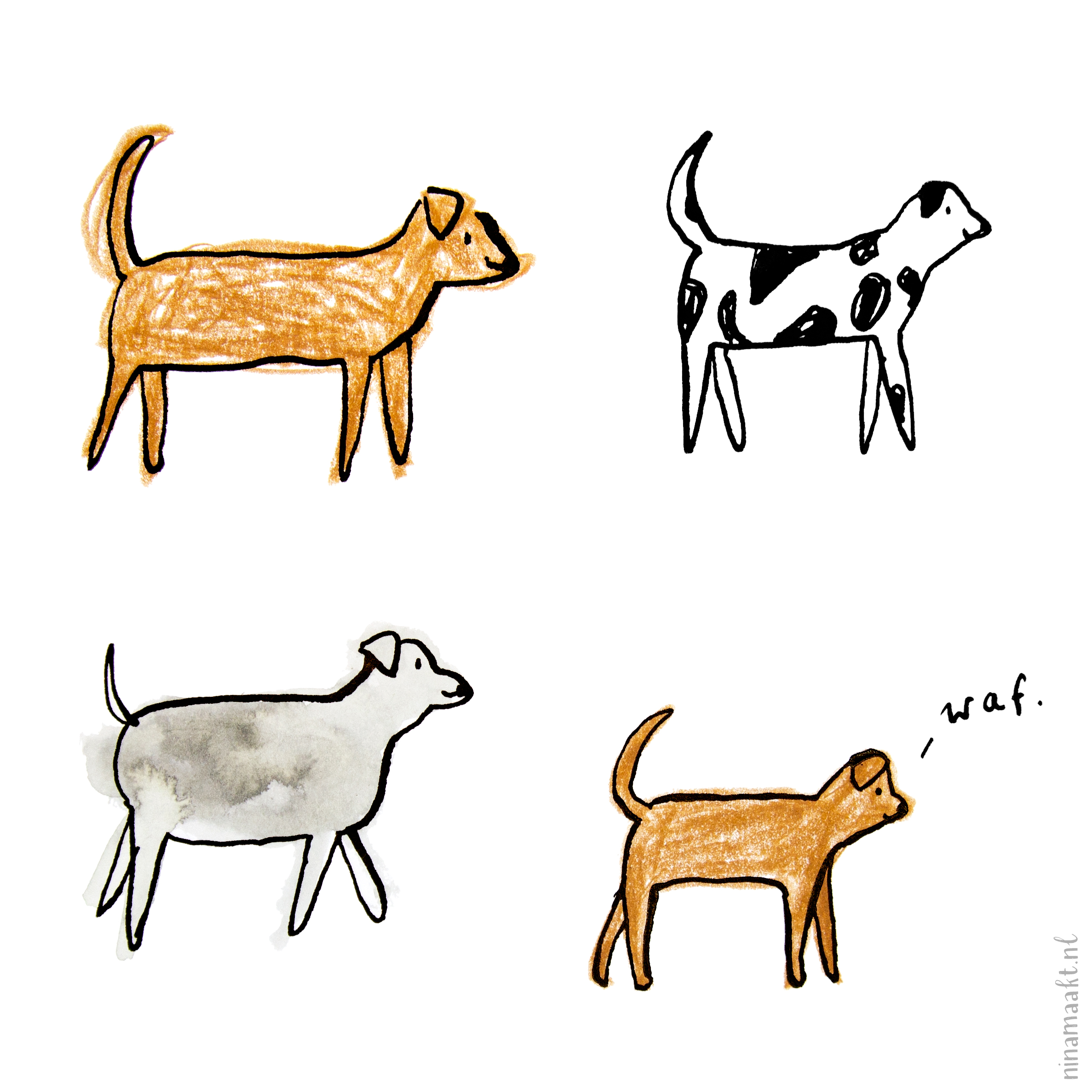 Naast mijn eigen nieuwe kaarten, werkte ik vooral veel in opdracht voor klanten. Een geboortekaartje hier, een proefschriftomslag daar, een set van twee posters voor weer iemand anders. Deze kwispelende hondjes gebruikte ik uiteindelijk niet, maar ik werd er wél heel gelukkig van. Juist omdat ze zo klungelig en imperfect zijn :-)
