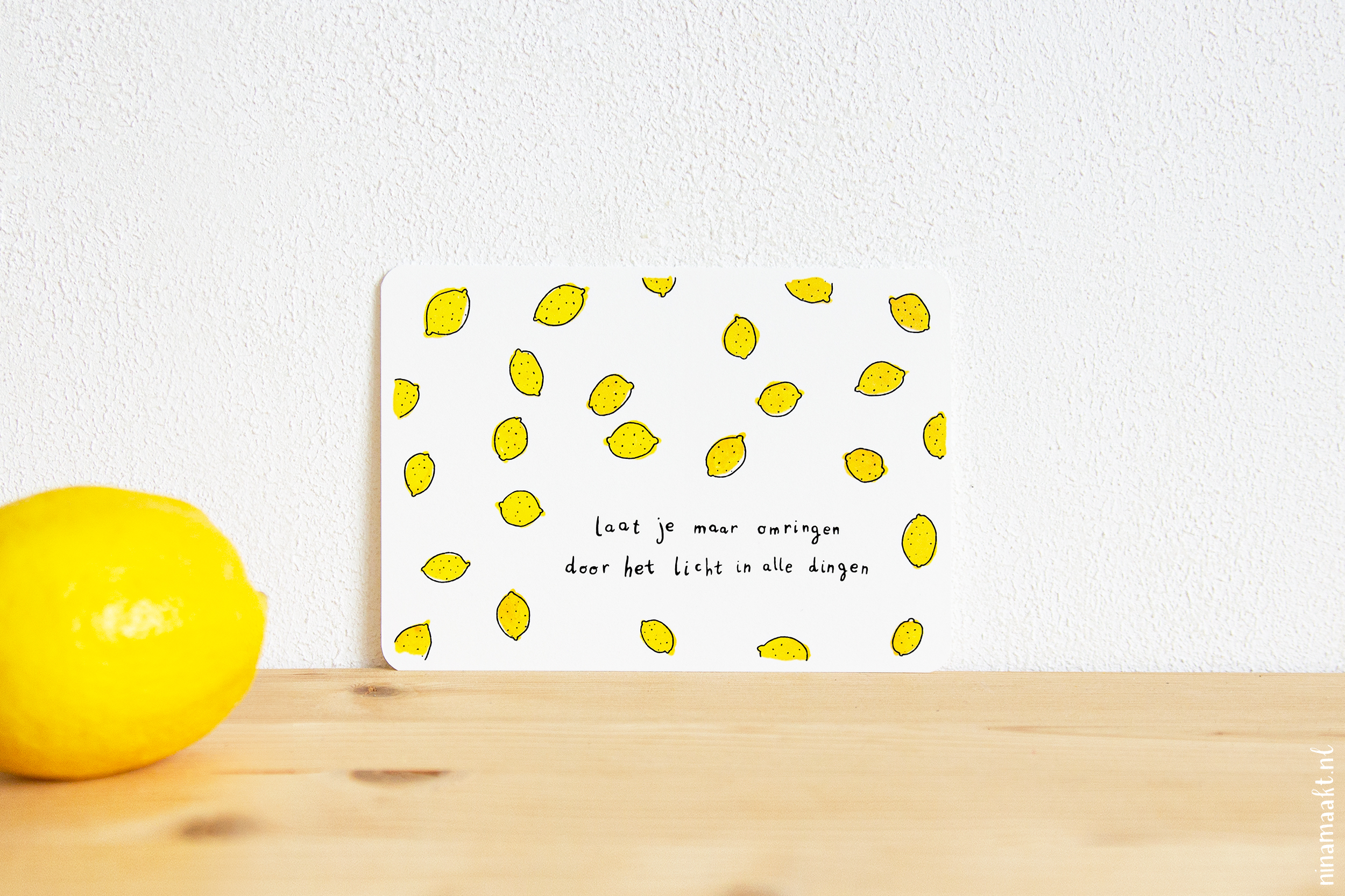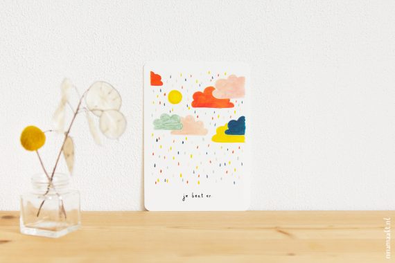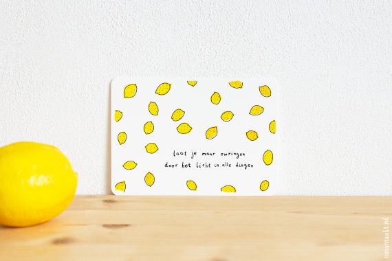 Hoe dan ook, ze zijn er nu! Een kaart met citroenen over licht, een kaart met vrolijke gekleurde regen, en een kaart met een mooi ginkgoblad en wat rijmende regels over het hier en nu. Ze staan alle drie in de webshop en ik ben er reuzeblij mee.