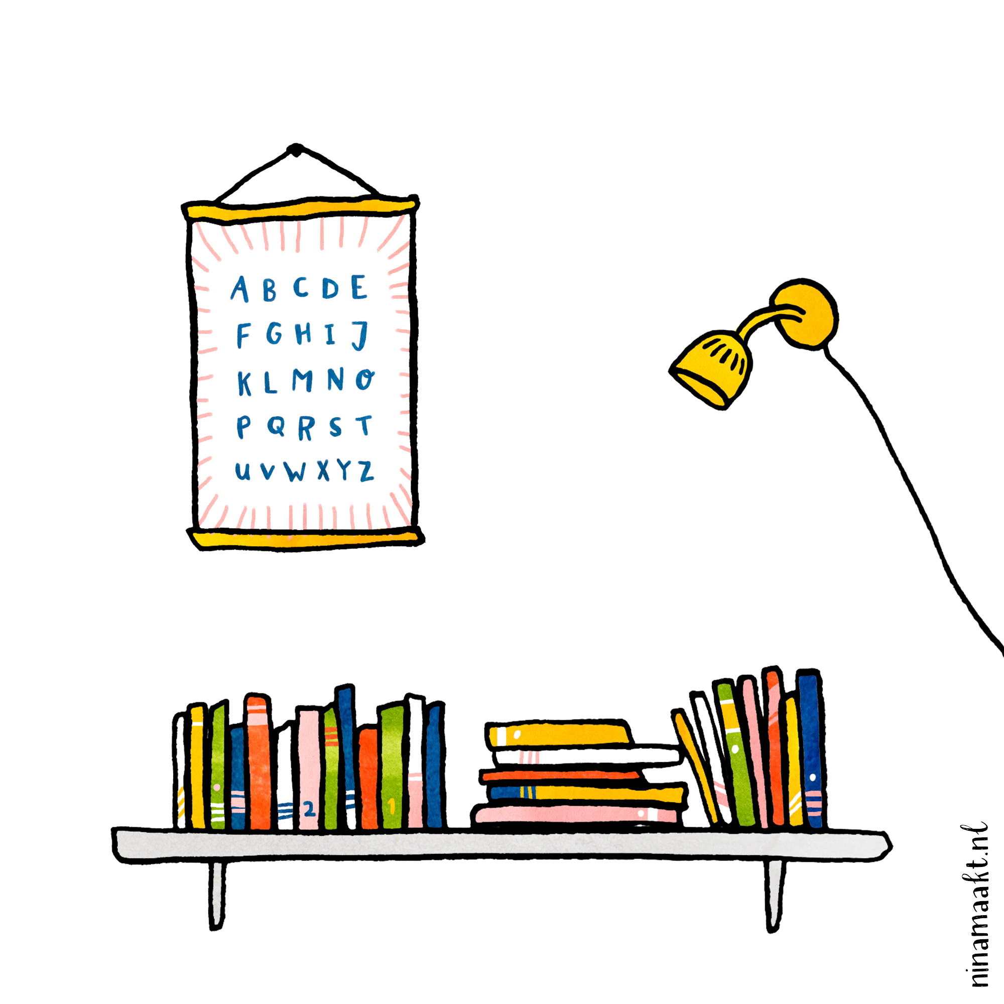 Ja, pfoe, er was werk te doen! En niet zo’n beetje ook, want de komkommertijd is duidelijk voorbij. Ik maakte drie nieuwe kaarten (ze komen gauw in de webshop, beloofd!), ik ontwierp twee geboortekaarten op maat en en o ja, ik maakte een stuk of zes illustraties voor het kinderboek. Zes illustraties klinkt misschien als een peulenschil (met dank aan de vriendin die dit woord weer terug in mijn vocabulaire heeft gebracht), maar de boekillustraties zijn behoorlijk uitgebreid: helemaal in kleur en inclusief mensen die op fietsen zitten, in bed liggen of aan het eten zijn. En dat alles bij elkaar is een hoop werk. Kijk, hier is alvast een ienieminivoorproefje: