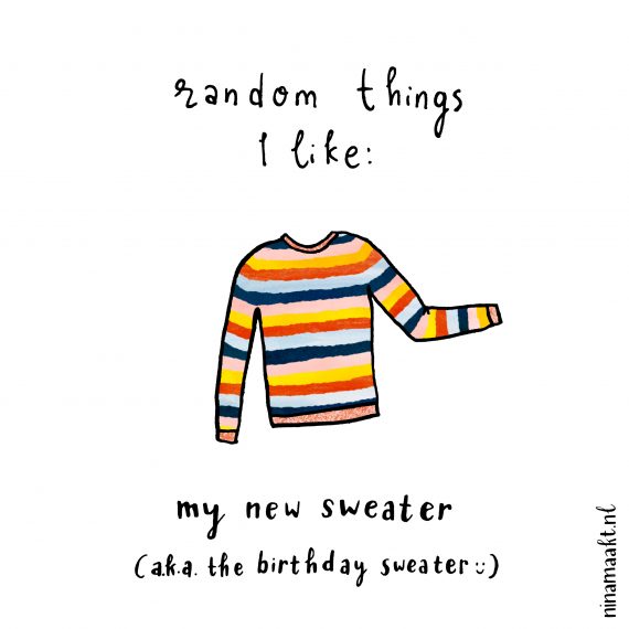 Het kan weer! Na die hete zomer vond (en vind) ik het heerlijk om weg te kruipen in warme vesten en truien. Ik kocht een paar maanden terug al een heel fijn vest bij de kringloop dat per ongeluk bij al mijn shirts matcht, dus daar woon ik zo’n beetje in. En o ja, mijn verjaardagstrui! Eind augustus werd ik verliefd op een hele vrolijke trui met blije strepen, dus toen ik had besloten een verjaardagsfeestje te geven, leek dat me de perfecte reden om die trui te kopen. Want op een feestje moet je er nu eenmaal feestelijk uitzien en dat is ‘ie. Dus ik kocht ‘m en liet ‘m heel gedisciplineerd drie weken in mijn kast liggen, zodat ‘ie op mijn verjaardag de primeur zou beleven! Het was toen zomaar ineens 21 graden, maar gelukkig is het op mijn werk altijd wat kouder, dus ik droeg ‘m lekker toch. En nu voel ik me nog steeds heel feestelijk, elke keer als ik ‘m aan heb. Hoera!