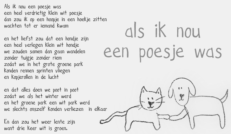 Sinds een jaar of vijf schrijf ik wel eens gedichten. Soms ineens heel veel, soms een poosje niks. Maar dat geeft niet, het is gewoon heel fijn om mijn hoofd even open te kunnen zetten en de inhoud ervan op een papier te gooien. Af en toe zal ik er eentje op deze blog zetten. Vandaag een gedichtje dat ik eind 2009 schreef met bijbehorende tekening (toen ik nog geen scanner en geen photoshop had..).